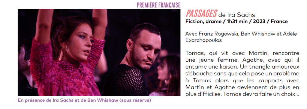 Les noms des jurys de la sélection Formats Courts et Longs Métrages, ainsi que ceux des invités d’honneur, ont déjà été communiqués (lire notre article ici). Rendez-vous à la cérémonie d’ouverture – déjà reservable – le 20 juin à 19h à l’UGC Normandie pour lancer une semaine de découvertes humaines et artistiques. Pour l’occasion, l’artiste Silly Boy Blue viendra performer juste avant la projection en avant-première du nouveau film d’Ira Sachs, invité d’honneur du festival, “Passages” en sa présence et celle de l’acteur Ben Whishaw.