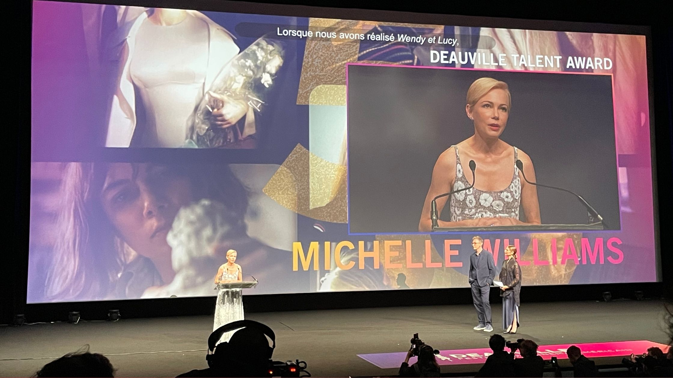 Et comme le festival du Cinéma Américain de Deauville a décidé de bien nous gâter, nous avons eu l’honneur de voir Michelle Williams recevoir le Deauville Talent Award pour célébrer une carrière bien remplie. L’actrice a également inauguré sa cabine de plage sur les célèbres planches en bord de mer. Rappelons que Michelle Williams a tourné avec les plus grands de Martin Scorsese à Steven Spielberg, en passant par son amie Kelly Reichardt mais aussi Wim Wenders, Todd Haynes ou encore Kenneth Lonergan dans le brillant Manchester By The Sea.